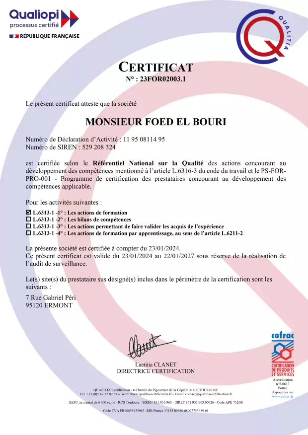Nos formateurs sont tous des experts dans leur domaine, avec plus de 15 à 20 ans d'expérience, garantissant ainsi une transmission de connaissances approfondies et pertinentes.